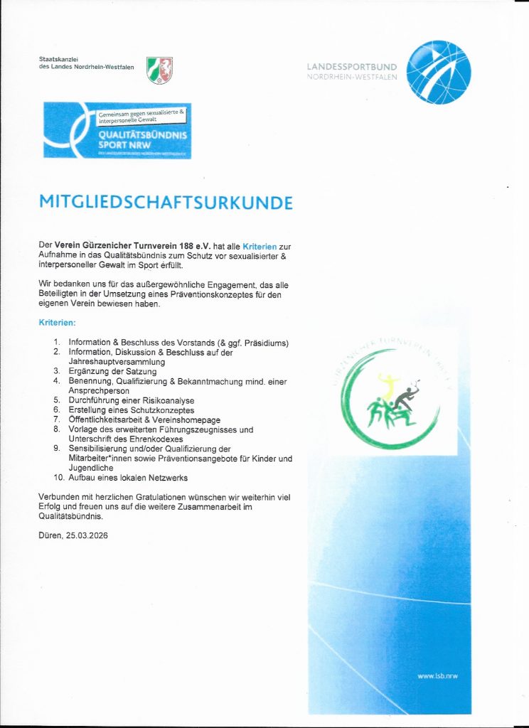 Der Gürzenicher Turnverein (GTV) wurde in das Qualitätsbündnis zum Schutz vor sexualisierter und interpersoneller Gewalt aufgenommen. Dies teilte der Verein jetzt mit. Das Qualitätsbündnis wurde von der Landesregierung und dem Landessportbund NRW ins Leben gerufen und soll dem Gewaltschutz dienen.